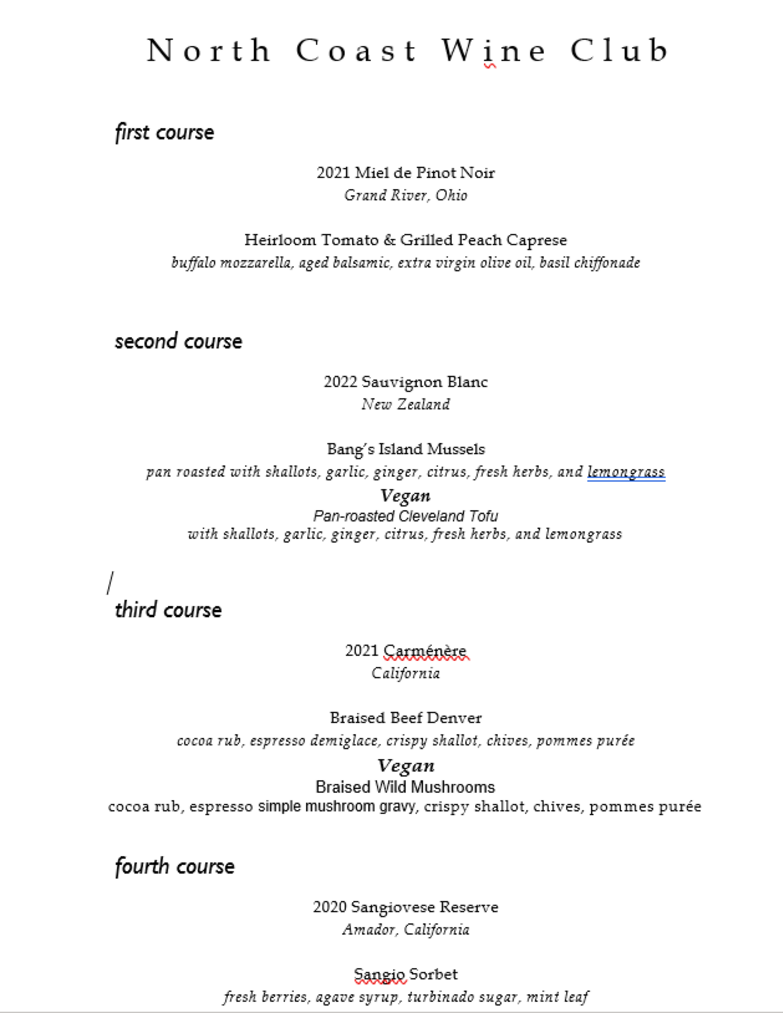 The first annual WINE AND DINNER PAIRING is on Tuesday, September 19, 2023, at 6:30 at NCWC.